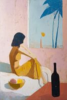 Een sfeervol schilderij in warme pasteltinten toont een rustgevend tafereel van een vrouw in een gele jurk, zittend bij een raam met uitzicht op palmbomen. De minimalistische compositie wordt verrijkt door een zwarte wijnfles en een schaal met fruit, wat een mediterrane sfeer oproept. De zachte roze muren en het lichte blauw van de…