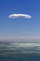 Foto op het strand van Cádiz (Andalusië), Spanje. Als een aureool staat een wolk boven de Atlantische Oceaan. Vanaf het strand in Cádiz kun je de prachtige weerspiegeling in de zee zien. Een prachtige minimalistische opname.