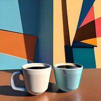 Das Kunstwerk zeigt eine Szene in einem modernen Café, in der ein Kaffeebecher im Mittelpunkt steht. Der Hintergrund ist mit abstrakten Formen und Mustern verziert, die an Kaffeebohnen und Dampf erinnern. Das Werk strahlt eine ruhige und gemütliche Atmosphäre aus, die perfekt zur Umgebung eines Cafés passt. Die Verwendung von kräftigen Farben und abstrakten Formen verleiht dem Werk eine moderne und zeitgemäße Note und zieht die Aufmerksamkeit des Betrachters auf sich.