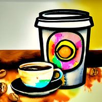 Das Kunstwerk zeigt eine Szene in einem modernen Café, in der ein Kaffeebecher im Mittelpunkt steht. Der Hintergrund ist mit abstrakten Formen und Mustern verziert, die an Kaffeebohnen und Dampf erinnern. Das Werk strahlt eine ruhige und gemütliche Atmosphäre aus, die perfekt zur Umgebung eines Cafés passt. Die Verwendung von kräftigen Farben und abstrakten Formen verleiht dem Werk eine moderne und zeitgemäße Note und zieht die Aufmerksamkeit des Betrachters auf sich.
