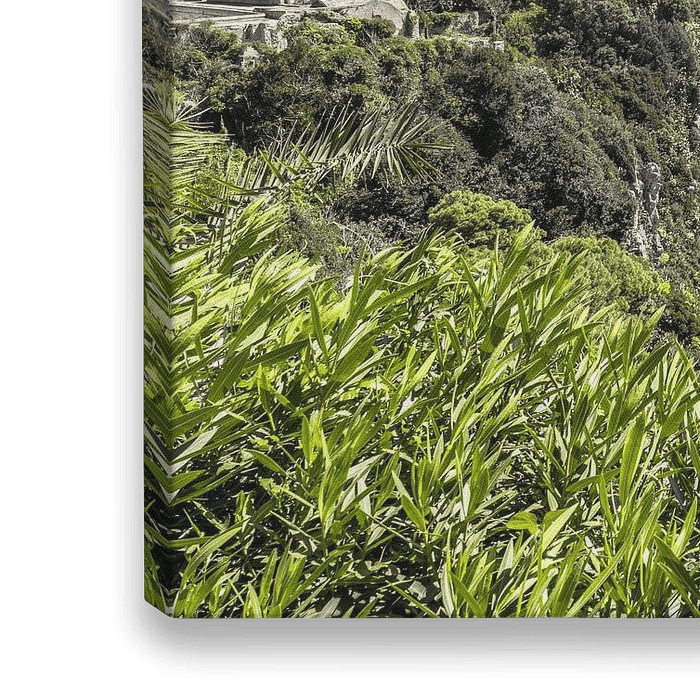 Een paradijselijk uitzicht op Capri, omlijst door tropisch gebladerte, onthult de legendarische Faraglioni rotsen, die als stenen schildwachten oprijzen uit de kristalheldere zee. De weelderige vegetatie op de kliffen, bezaaid met elegante villa's, straalt rust en exclusiviteit uit. Het diepblauwe water glinstert in de zon, terwijl de hemel zich onberispelijk daarboven uitstrekt. Capri, een eiland synoniem voor stijl, elegantie en natuurlijke wonderen, verleidt met zijn mediterrane flair, adembenemende uitzichten en tijdloze schoonheid. Een plek die inspireert, betovert en de droom van de dolce vita tot leven brengt.