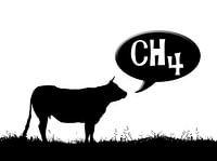 Silhouette of a cow on a dike with a speech bubble burping methane. It has been found that there has been an increase in greenhouse gases in the atmosphere which in turn leads to climate change and global warming. The amount of methane (CH4) has increased dramatically caused amongst other reasons by the increase of cattle breeding.…