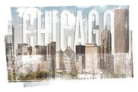 Chicago is een stad aan de zuidwestelijke oever van Lake Michigan in de staat Illinois/USA. Een klassieke kijk op de skyline in een decoratieve vintage stijl met typografie.