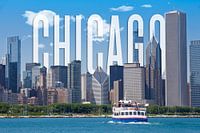 Chicago is een stad aan de zuidwestelijke oever van Lake Michigan in de staat Illinois/USA. Een klassieke weergave van de skyline in monochroom met typografie.