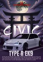 Een witte Honda Civic Type R EK9 is afgebeeld tegen een paarse en zwarte achtergrond. De auto staat voor een traditionele Japanse torii poort, met een grote, volle maan zichtbaar in de lucht. De koplampen van de auto's zijn verlicht en de 'CIVIC'-belettering is prominent in het wit weergegeven.