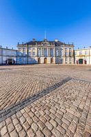 Amalienborg werd gebouwd in de 17e eeuw en wordt tegenwoordig beschouwd als een van de meest indrukwekkende rococo-gebouwen van Denemarken. Het bestaat uit vier paleisgebouwen en is de stadsresidentie van de koninklijke familie in Kopenhagen. Verlaten uitzicht vanaf het paleisplein met de kasseien die typisch zijn voor het historische stadshart.