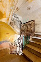 Cubaans tafereel. Vervallen trappenhuis in een oud koloniaal pand met mooie ijzeren traphek. Kapot stucwerk in diverse kleuren. Een bijzonder verlaten plek.