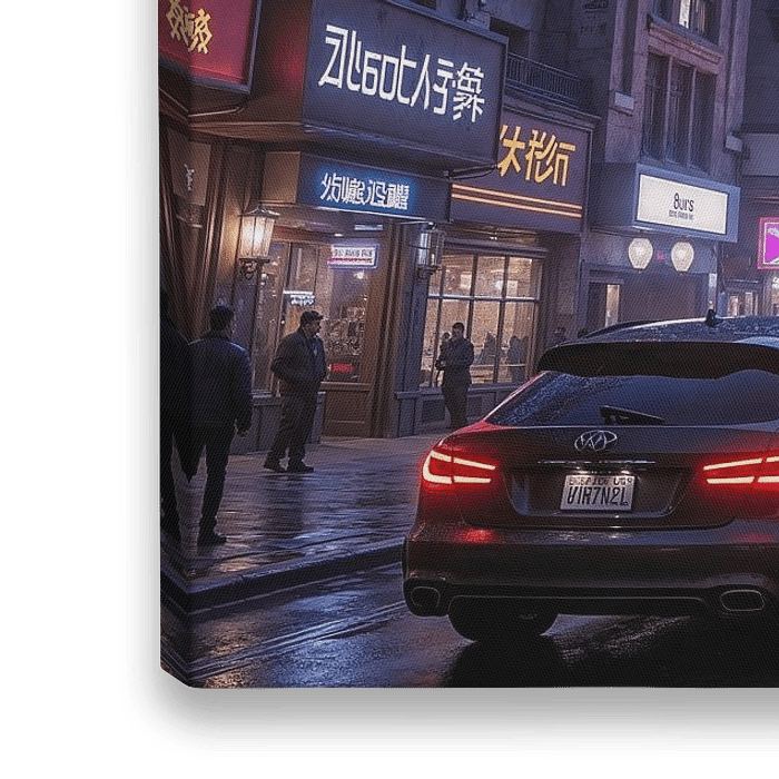 Hyperrealistische scherpte in elk detail: het glinsterende asfalt, de reflecties, de textuur van de gevels en de gloed van de neonlichten. Met de modernste high-end technologie wordt de scène een filmisch meesterwerk vol diepte en precisie – een beeld dat leeft, gloeit en ademt.