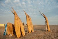 Huanchaco Peru "Caballitos de totora" stand on their ends near the Pacific Ocean. Caballitos de totora are traditional reed craft believed to have been used by Peruvian fisherman for the past three millenia.
