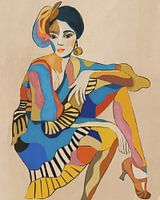 Een modernistische afbeelding van een cabaretdanseres, samengesteld uit gedurfde geometrische vormen en levendige kleurvlakken, die de elegantie, het ritme en de theatrale allure van het podium oproepen.