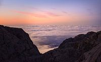 Een wolkenzee bedekt het lagergelegen landschap bij zonsondergang in de Picos de Europa, Noord-Spanje.