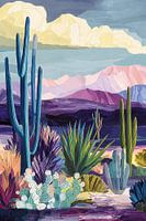 Een levendige digitale illustratie van een woestijnlandschap in onconventionele kleuren. Majestueuze saguaro cactussen in blauw rijzen op tegen een achtergrond van lavendelkleurige bergen. Het landschap wordt verrijkt door diverse woestijnplanten in felle kleuren, van roze tot turquoise, terwijl gele wolken dramatisch afsteken tegen de pastelblauwe lucht.