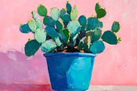 De pot schittert in helder blauw, terwijl de tintelende cactusbladeren eruit groeien in zachte groentinten. De levendige compositie wordt harmonieus aangevuld door een zachtroze muur op de achtergrond. Een glimlach van de natuur die vrolijkheid en levensvreugde uitstraalt trekt op magische wijze de aandacht.