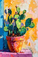Levendige kleuren dansen op de muur en omlijsten de heldere pot, die trots een stekelig karakter heeft. De cactusbladeren, glinsterend in verschillende groentinten, vallen op met hun lichte, bloeiende knoppen. Een harmonieus samenspel van natuur en felle kleuren dat warmte en mediterrane flair uitstraalt.