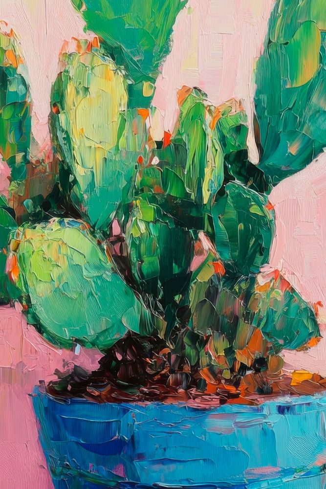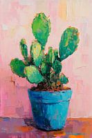 Een levendige cactus met dikke groene bladeren prijkt in een opvallende blauwe pot en vult de kamer met kleur. De zachte pastelkleurige muren creëren een harmonieuze achtergrond, terwijl de aardse texturen de charme van de natuur weerspiegelen. Een vrolijk samenspel dat levendigheid en rust combineert.
