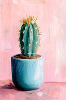 Een stekelige hoofdpersoon troont trots in zijn glanzende, zachtblauwe beker, terwijl delicate, crèmekleurige stekels schitteren in het licht. De delicate, roze achtergrond valt harmonieus op en creëert een levendige, uitnodigende sfeer. Hier ontmoet woestijnflora modern design - een perfect samenspel van natuur en kunst!