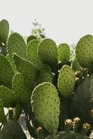 De groene tinten van de cactussen steken scherp af tegen de lucht die door de zon verlicht wordt. Het zonlicht benadrukt de textuur van de cactussen, waardoor de stekels en ribbels goed zichtbaar zijn. Deze cactussen, typerend voor het mediterrane klimaat van Calabrië, gedijen goed in de warme en droge omstandigheden.