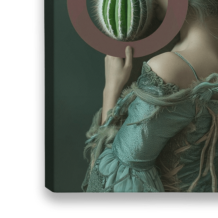 Portret van een vrouw en de liefde voor haar cactus. Mooie complementerende kleurstelling in groen, roze, beige en aubergine. Romantisch, zacht en stekelig tegelijkertijd. Cactus als haarversiering. Daarnaast kust zij een stekelige cactus. Symbolisatie van liefde in al haar facetten. Enigszins abstract door een twist van een cirkel.…