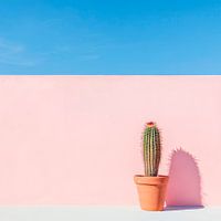 Op deze foto harmoniëren kleuren en vormen op een bijzondere manier: Een slanke cactus in een terracottakleurige pot troont voor een zachtroze muur. De helderblauwe lucht vult het beeld aan en werpt een uitnodigend licht op het landschap. De heldere lijnen en de schaduw van de cactus geven de compositie een moderne, minimalistische esthetiek.