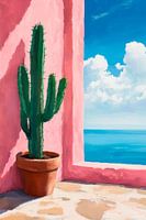 Op de foto zie je een majestueuze cactus in een terracottakleurige pot voor een felroze muur staan. De helderblauwe lucht en de zachte wolken op de achtergrond geven het tafereel een frisse, uitnodigende sfeer. De harmonieuze combinatie van kleuren en het uitzicht op zee creëren een gevoel van rust en mediterrane flair.