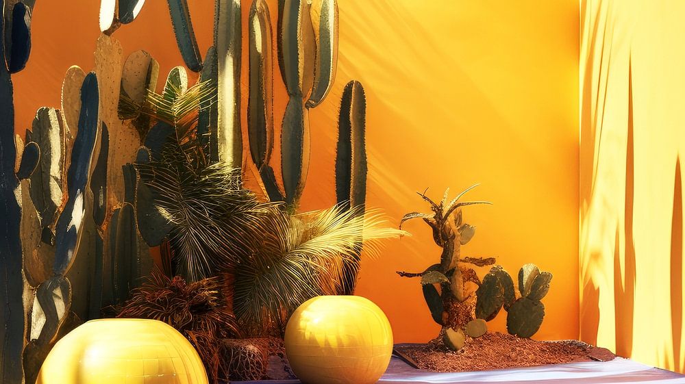 De compositie is doordacht uitgebalanceerd, met weelderige groene cactussen in gele potten die een warme, organische touch toevoegen aan de strakke architecturale lijnen. De schaduwen van de zuilen werpen een geometrisch patroon op de blauwe trap, wat diepte en dimensie geeft aan de scène. De serene atmosfeer wordt versterkt door de glanzende, reflecterende vloer die de kleuren en vormen weerspiegelt.