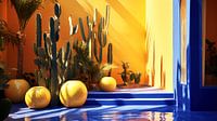 De compositie is doordacht uitgebalanceerd, met weelderige groene cactussen in gele potten die een warme, organische touch toevoegen aan de strakke architecturale lijnen. De schaduwen van de zuilen werpen een geometrisch patroon op de blauwe trap, wat diepte en dimensie geeft aan de scène. De serene atmosfeer wordt versterkt door de glanzende, reflecterende vloer die de kleuren en vormen weerspiegelt.