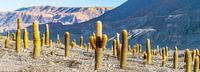 Enorme cactussen hoog in de Andes op de ruta 51 van Salta in Argentinie naar Chili in het late middag licht.