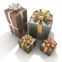 3D rendering van cadeautjes in goud zilver en brons kleur. Chique 3d illustratie van pakketjes, leuke print voor aan de muur in een cadeau winkel tijdens de feestdagen.