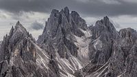 De toppen van Cadini di Misurina voelen alsof ze bijna een amfitheater vormen op deze plek in het natuurpark Tre Cime. Als je voor deze prachtige toppen staat, kun je niet anders dan onder de indruk zijn van de schaal van de bergen en de onmetelijke tijd die het kostte om ze vorm te geven.