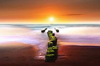 Golfbrekers in Cadzand- Bad, Zeeland, Nederland. Bij de prachtige kleuren van de zonsondergang. De foto is gemaakt met een lange sluitertijd van 4 minuten, door middel van het plaatsen van een 10- stopsfilter voor de lens.