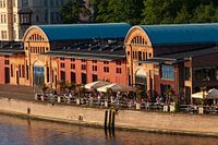 Café Bar Celona in een oude havenloods aan de oever van de rivier Trave in het avondlicht, Lübeck, Sleeswijk-Holstein, Duitsland, Europa