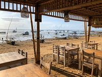 Met op de voorgrond het terras met warme, sfeervolle houten meubilair en in de achtergrond de vissersboten van de Balinese vissers tijdens eb die op hun kiel liggen.