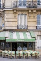 Het cafe in dit beeld voldoet dan ook aan alle kenmerken, van een Parijse bistro. De zandstenen gevel met sierlijke ornamenten, worden afgewisseld met zwarte stalen balkons en witte raamluiken. Het cafe heeft een groen met wit gestreepte luifels en klassieke bistro stoeltjes, welke dezelfde kleur hebben.
