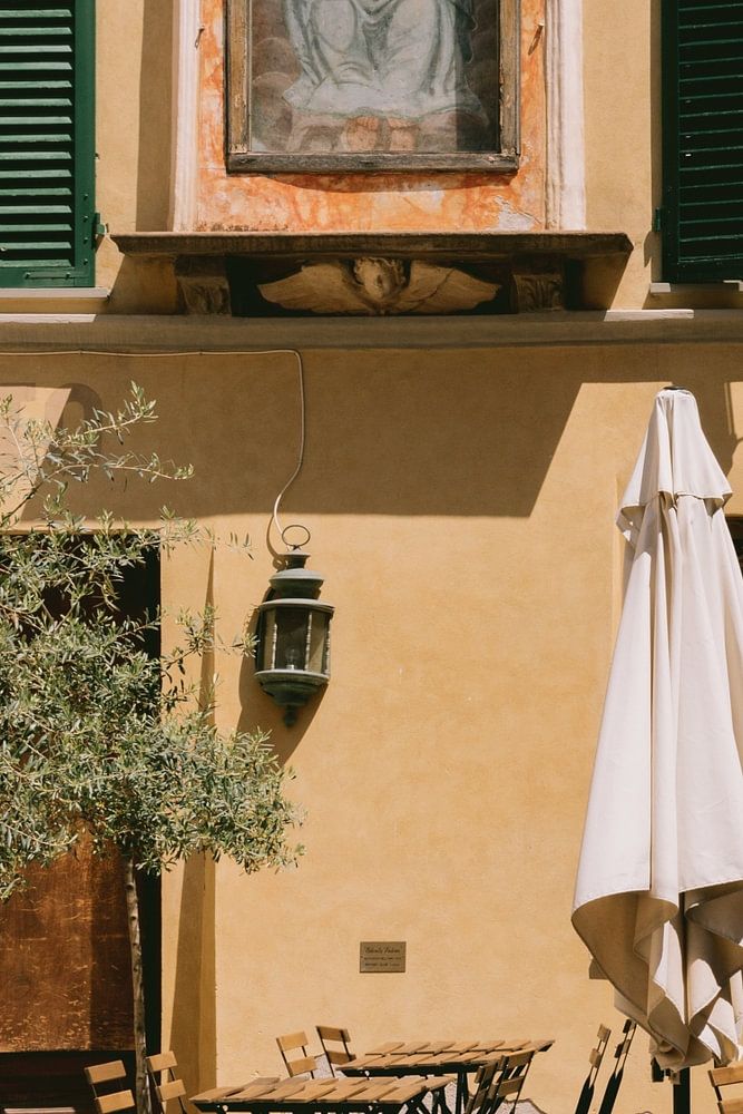 Het charmante plaatsje Lucca. Deze foto is genomen tijdens de hete middaguren. Sommige cafés waren gesloten voor een kleine pauze. De gebouwen in Lucca zijn geverfd in prachtige, zomerse kleuren, zoals hier.