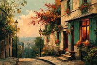 Een schilderachtig straattafereel in Montmartre, Parijs, waar warme herfstkleuren de romantische sfeer versterken. Karakteristieke groene luiken en rode geraniums sieren de klassieke gevels, terwijl gietijzeren lantaarns de kronkelende straat verlichten. De gloed van de ondergaande zon werpt een betoverend licht over de stad die zich uitstrekt in de verte, terwijl vallende herfstbladeren de nostalgische stemming versterken.