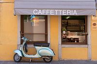 Op de voorgrond zie je de straat, waar de scooter op geparkeerd staat. Deze heeft een retro uitstraling en een metallic groene kleur, welke waarschijnlijk van een klant in het cafe is. Daarachter is de kleurrijke gevel met twee grote ramen, boven de ramen is een luifel. Deze is grijs van kleur en is bedrukt met het woord "Caffetteria".