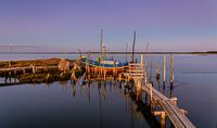 De plaats Carrasqueira ligt aan de lagune die ontstaat door de afvloei van de Rio Sado. De vissers hebben in het verleden zelf allerlei steigers en krakemikkige loopplanken gemaakt om bij hun bootjes te kunnen komen. Het resultaat is een wirwar aan palen en planken, en alles bij elkaar een heel leuk en pittoresk gezicht. Deze foto is gemaakt net na zonsondergang met gebruik van een lange sluitertijd.