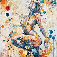 Caleidoscoop - Met helder kleurgebruik en dynamische druppels brengt dit urban art schilderij een spontane energie in de ruimte. De abstracte vormen en expressieve lijnen vloeien rond de centraal geplaatste figuur, wat een gevoel van beweging en levendigheid geeft. De caleidoscoop aan kleurstippen vormt een speels contrast met de zachte…
