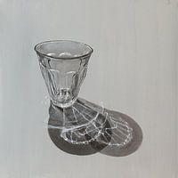 Schilderij 'Caleidoscope' gaat over licht. Ik hou ervan om aan een schilderij te werken met allerlei reflecties, sprankelingen, scherpe lijntjes en contrast. Terwijl mijn abstract werk overloopt van kleur, heb ik dat bij dit realistisch werk juist helemaal niet nodig. Het spel van licht, schaduw, vervormingen en transparantie van glas…