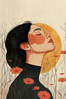 Dit kunstwerk toont een serene portretillustratie van een vrouw met gesloten ogen, haar gezicht opgeheven naar een warme, gouden cirkel die de zon symboliseert. Haar zwarte haar contrasteert met de zachte, warme tinten van haar huid en de oranje bloemen die haar omringen. De compositie straalt rust en harmonie uit, waarbij de vrouw één lijkt te worden met de natuur om haar heen. De stijl combineert elementen van art nouveau met moderne illustratietechnieken, wat resulteert in een tijdloos en toch hedendaags beeld.