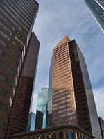Gezicht op wolkenkrabbers in het centrum van Calgary, Alberta, Canada in de middagzon met licht bewolkte hemel en weerspiegelingen op de moderne gevels van de gebouwen.