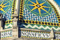 Een close-up van een mozaïekontwerp dat de gevel van een gebouw siert, met geometrische patronen en felle kleuren, voornamelijk blauw en geel. Latijnse tekst is geïntegreerd in het decoratieve tegelwerk, wat een historische of culturele betekenis suggereert.