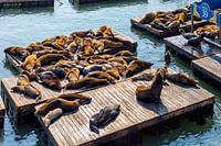 Een groep Californische zeehonden geniet van de zon bij Pier 39 in San Francisco.