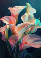 Calla schilderij - Dit bloemenschilderij toont een reeks Calla lelies in een lichtgevende, bijna droomachtige stijl die levendigheid en een etherische schoonheid weergeeft.