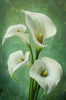 Callalelie | Graceful Silence - Dit bloemenschilderij toont een elegante compositie van callalelies, met hun karakteristieke trompetvormige bloemen die rust en schoonheid uitstralen.