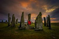 Woman in red dress at Callanish stones in sunset light, Lewis, Scotland