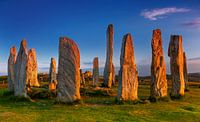 Zonsondergang bij de historische Callanish Standing Stones, Isle of Lewis, Schotland. Deze steencirkel werd circa 3000 geleden opgericht. Het is een kruisvormig patroon met in een cirkel geplaatste stenen eromheen. In het midden staat een grotere steen, een monolith, van bijna 5 meter hoogte. Dit is een van de hoogtepunten van de Outer Hebrides of Western Isles.
