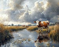 Calm Before the Storm Grazing - Dit landschap schilderij toont een serene Nederlandse plattelandsgezicht met in de voorgrond koeien en een waterrijke omgeving, omgeven door weelderige velden onder een indrukwekkende wolkenlucht.