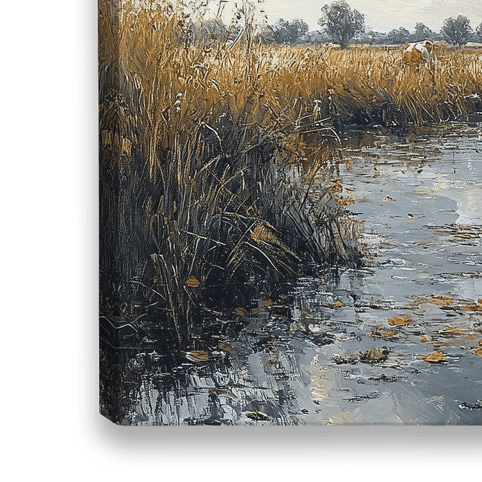 Calm Before the Storm Grazing - Dit landschap schilderij toont een serene Nederlandse plattelandsgezicht met in de voorgrond koeien en een waterrijke omgeving, omgeven door weelderige velden onder een indrukwekkende wolkenlucht.