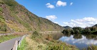 Bremm Germany Just beyond Bremm the River Moselle gorge reaches its steepest. Along the slopes hikers can “walk” an aided path, the Calmont Klettersteig. Appropriate footwear is needed. Autumn puffy clouds and azure skies are reflected in the waters of the river. Stitched panoramacliffs, felsen, vineyards, cycle path, radweg